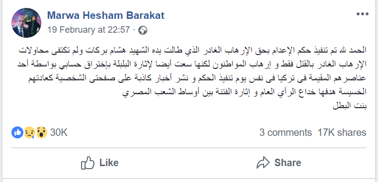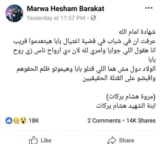 وفي سياق متصل انتشرت صورة لتصريح ابنة النائب العام هشام بركات على صفحتها على فيسبوك تبرئ فيها المحكومين من جريمة قتل أبيها، إلا أن شقيقها محمد هشام بركات أكد سرقة حساب شقيقته مروة وأوضح في منشور له عبر حسابه فيسبوك، قائلا: “صفحة أختي المستشار مروة هشام بركات مسروقة وكل ما ينشر على الصفحة ليس له أي صلة بأسرة الشهيد البطل المستشار هشام بركات”.